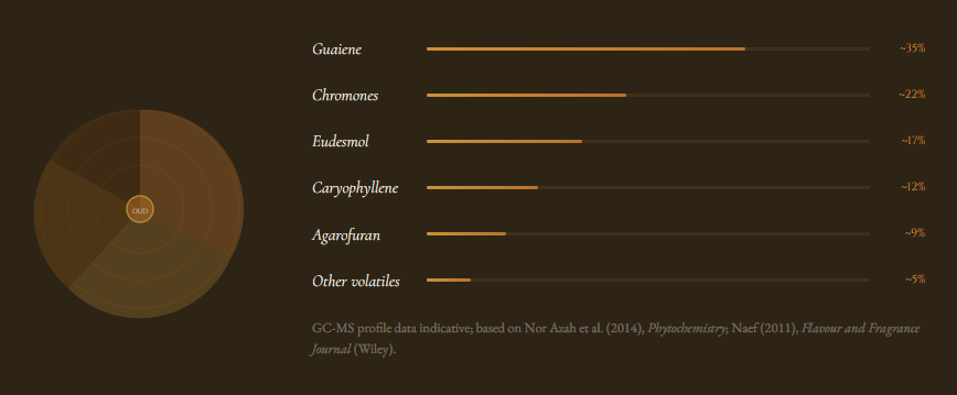 Research published in Phytochemistry (Elsevier, 2014) by Nor Azah et al. identified over 150 volatile compounds in high-grade agarwood essential oil, with α-guaieneδ-guaieneagarospirol, and jinkoh-eudesmol constituting the primary sesquiterpenoid markers of quality. Crucially, it is the ratio and concentration of these compounds — not merely their presence — that distinguishes a USD $3,000/kg grade from an USD $80,000/kg grade.